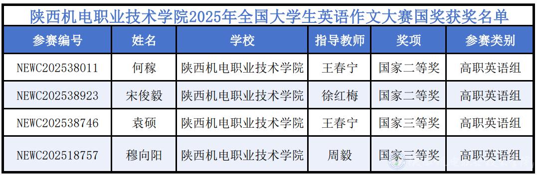 近日,由高等学校大学外语教学研究会、全国高等师范院校外语教学与研究协作组联合主办的2025年全国大学生英语作文大赛获奖名单正式揭晓。陕西机电职业技术学院学子在此次大赛中表现优异,共斩获国家级奖项4项、省级奖项30项,其中,国家级二等奖2项、三等奖2项,省级一等奖12项、二等奖11项、三等奖7项,获奖总数与层级均创历史新高。