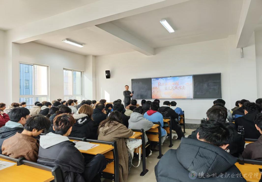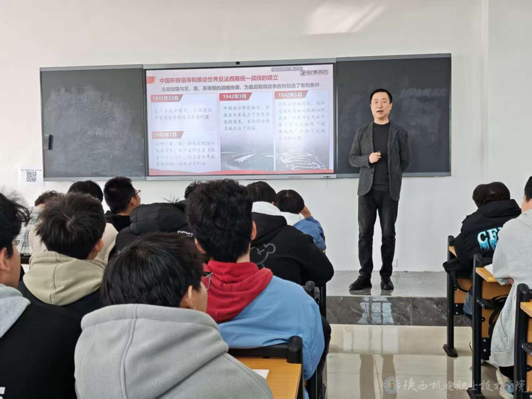 10月30日上午,陕西机电职业技术学院党委委员、副院长张克在启航楼301教室为25机电技术7、25机电技术8合班学生讲授形势与政策课《纪念抗战胜利 坚定民族信念》专题内容。