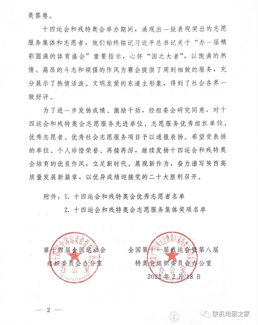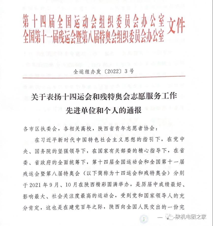 近日,第十四届全国运动会组织委员会办公室、全国第十一届残运会暨第八届特奥会组织委员会办公室联合印发了《关于表扬十四运会和残特奥会志愿服务工作先进单位和个人的通报》,我校荣获“十四运会和残特奥会志愿服务优秀组织单位”荣誉称号,我校学生胡世磊等7人荣获“十四运会和残特奥会优秀志愿者”荣誉称号。