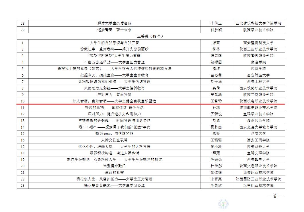 第四届陕西高校心理健康教育优秀教案评选中我校教师 张玉琼 获得 二等奖、王雪玲 获得 三等奖。