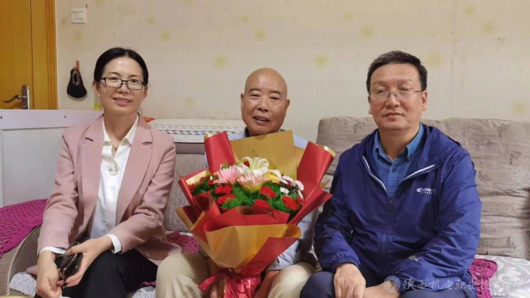 伊逊智(右二)、赵争东(左一)、康健(右一)慰问退休教职工梁玉波(左二)