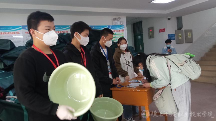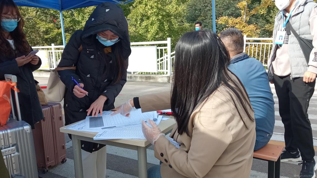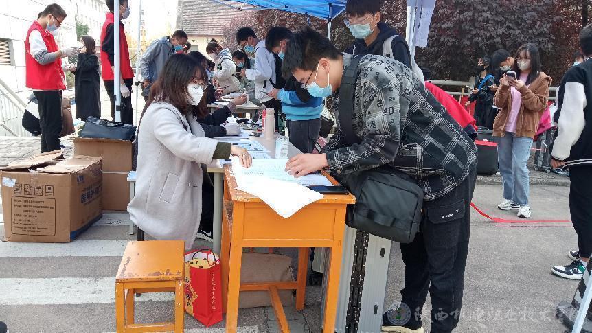 老师们早已准备好迎接每一位回家的孩子。“先做核酸”志愿者提醒到。学生们间隔一米线,戴好口罩,依次进行核酸检测。“大家按照二级学院排队登记”老师亲切的声音在耳畔响起,老师们详细询问学生返校的信息,如乘坐什么交通工具,车次,车牌号……“这位同学按照疫情防控要求需要居家监测”,“好的,请同学这边来先登记信息”。从校门口的扫码到进校后的核酸、登记排查,每一个环节,老师们都做到了精准。