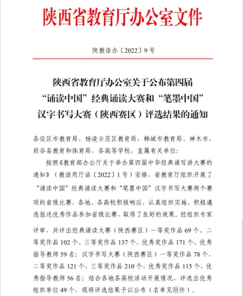 雅言传承文明,经典浸润人生。陕西省中华经典诵读大赛举办以来,我校高度重视、积极推动、广泛开展,为弘扬中华优秀传统文化,激发广大师生学经典、诵经典、用经典的热情提供了优质平台。本次比赛获奖,是我校始终坚持传承中华优秀传统文化,将文化育人贯穿教育教学全过程的丰硕成果。