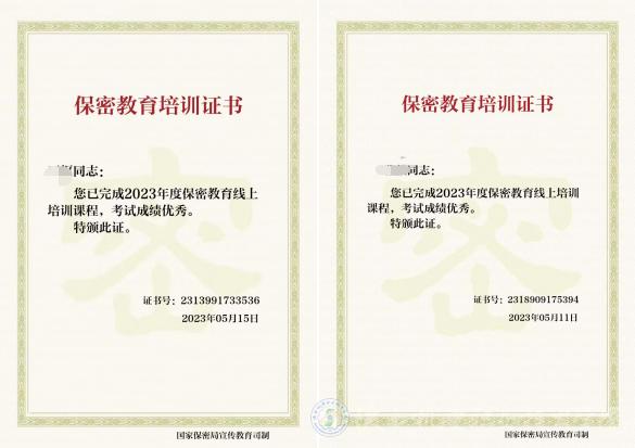 参加一次保密教育线上培训。截至5月22日,全校71名涉密人员通过登录“保密观”APP和中国保密在线网站培训系统,学习了保密优良传统、法律法规、基础知识、技术防范和警示案例等5个方面的相关知识,完成保密教育线上培训工作,取得培训优秀或合格证书。通过学习,参训人员进一步加深了对保密工作重要性的认识,对如何防泄密、管保密工作有了更准确地掌握。