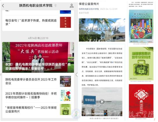 开展一次保密主题宣传。4月15日起,通过学校微信公众号推送保密公益宣传片、海报和保密科普教育视频;党政办官网开设保密工作专栏;博学楼一楼电子屏滚动播放官方保密公益宣传片、宣传标语;博学楼公告栏张贴保密宣传挂图;宝福路校区悬挂保密宣传横幅,营造了浓厚的宣教氛围,促进“维护国家安全,人人有责”意识入脑入心,进一步树牢了总体国家安全观,增强了师生员工维护国家安全,保守国家秘密的责任感和使命感。