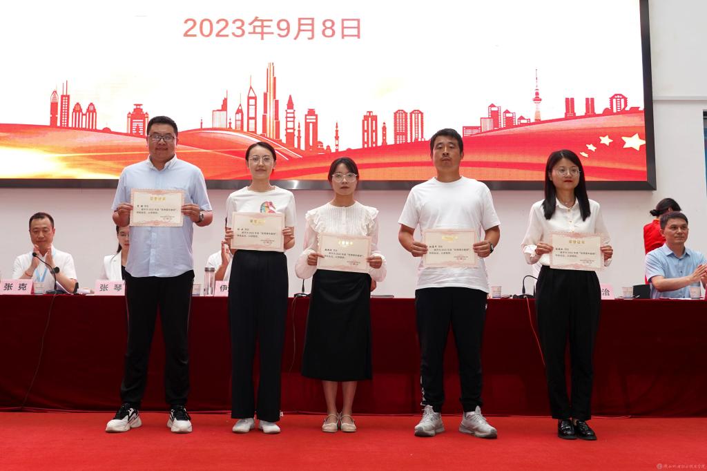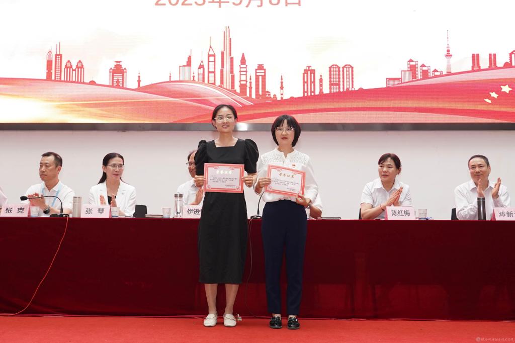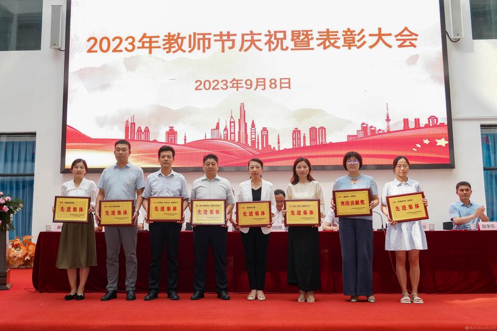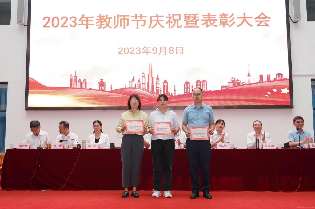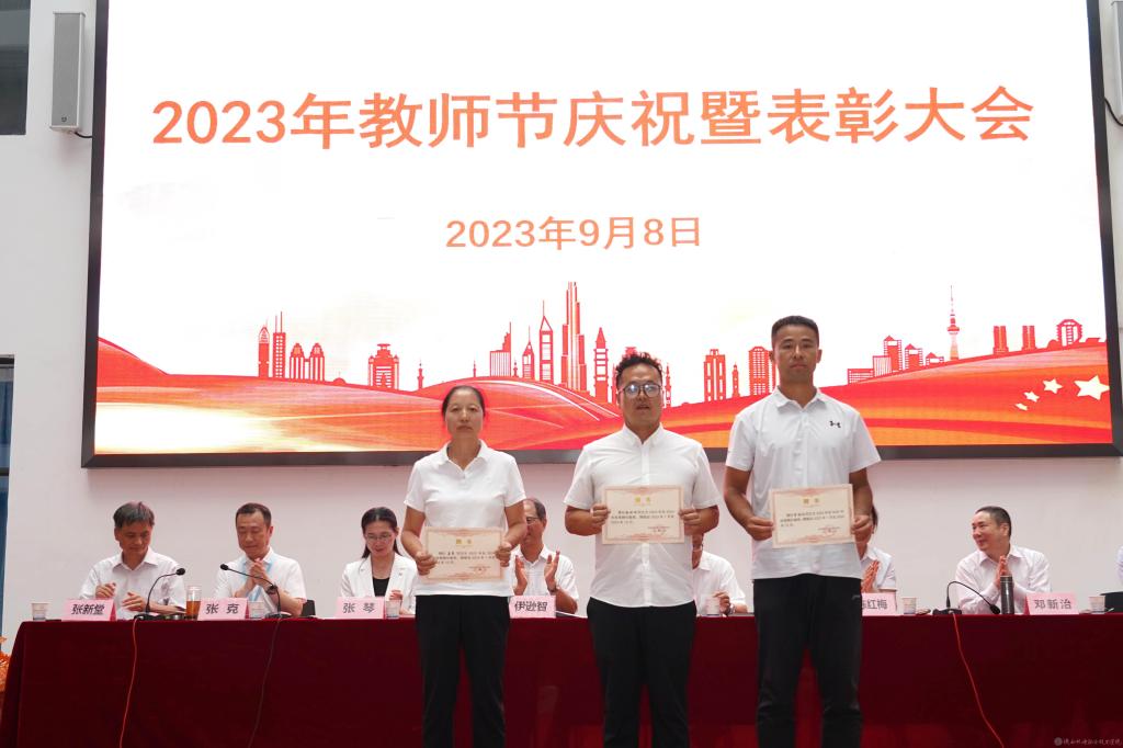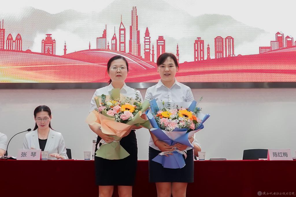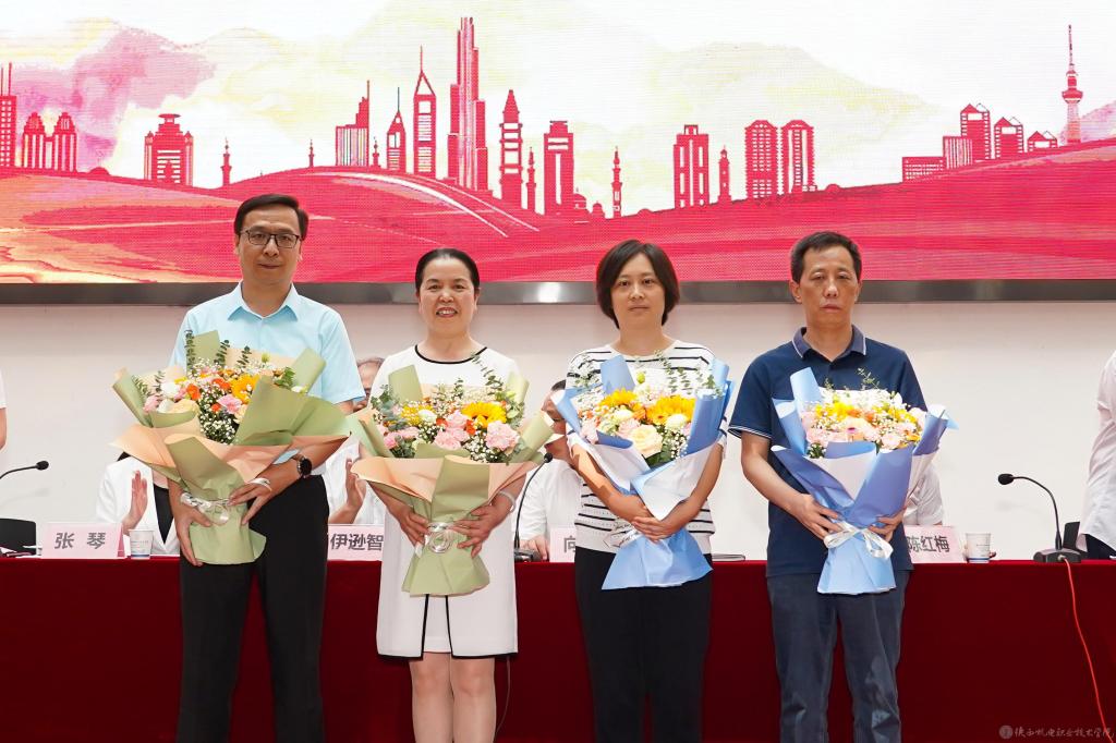 党委副书记张琴宣读《陕西省教育厅关于表彰第十三届陕西高职院校教学名师奖获奖教师的通知》并授予鲜花;宣读2022年度“先进集体”,2023年度“招生工作先进集体”表彰文件并颁奖。