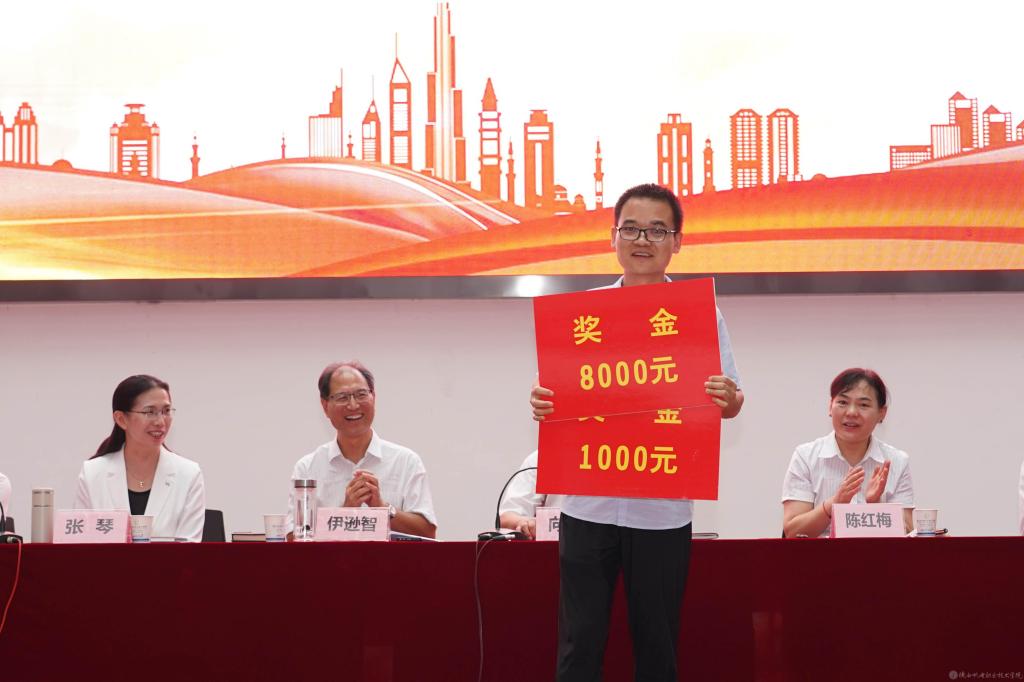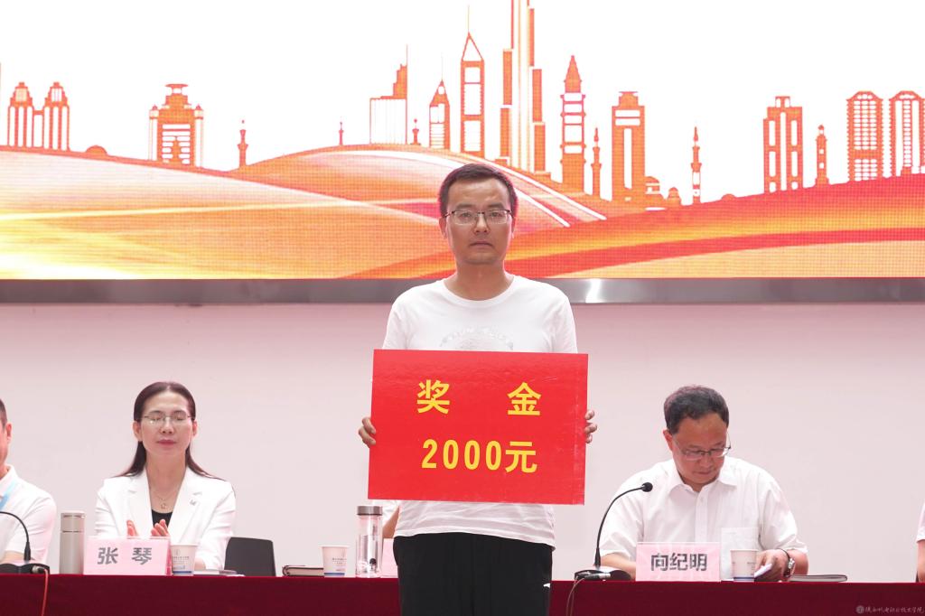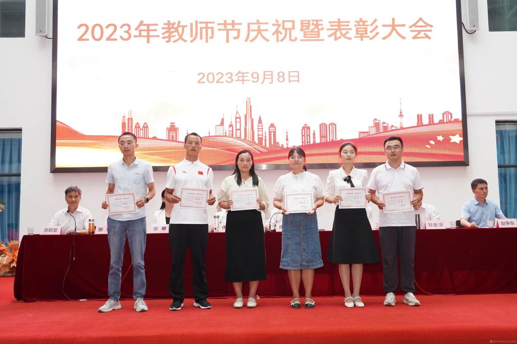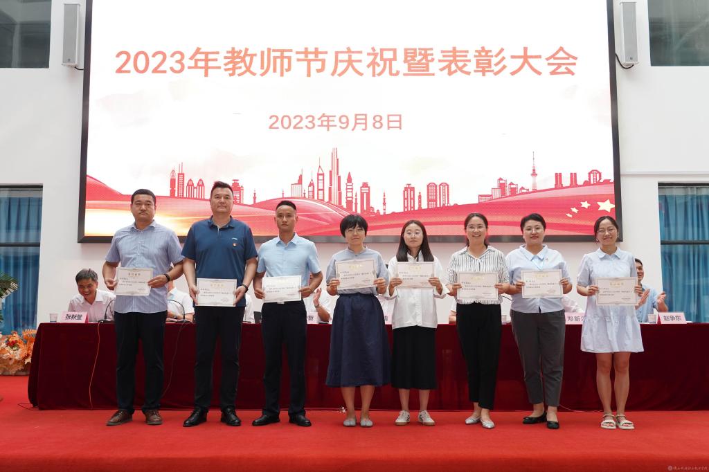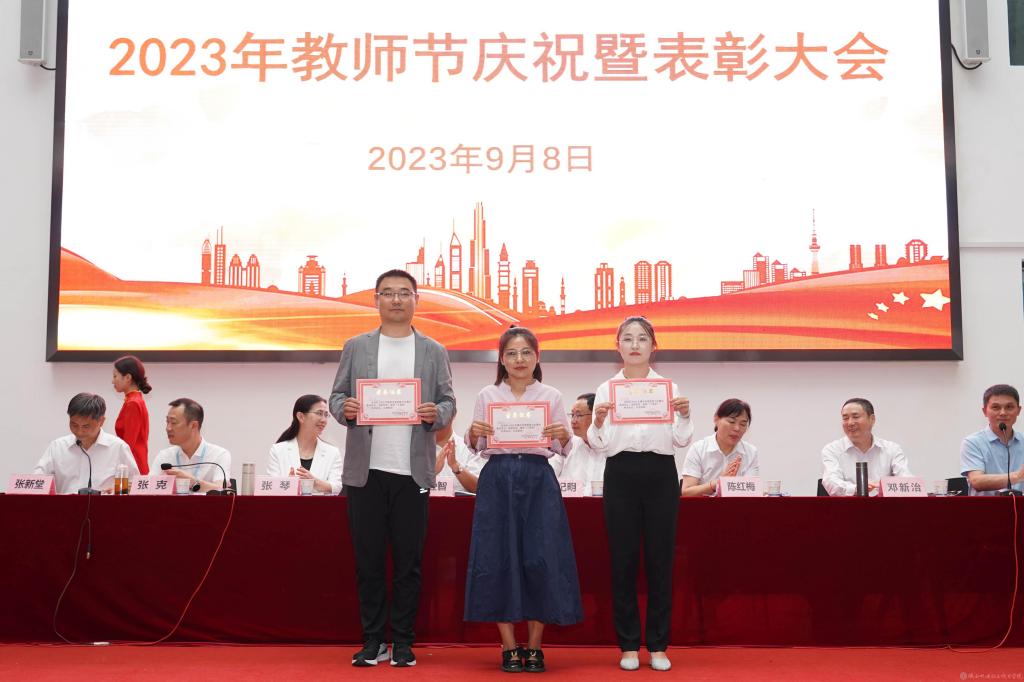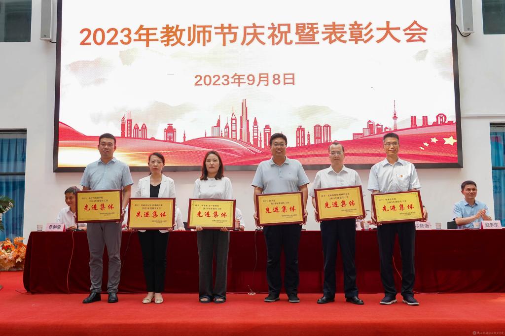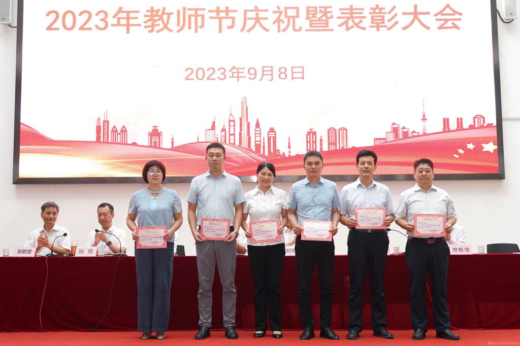 党委副书记张琴宣读《陕西省教育厅关于表彰第十三届陕西高职院校教学名师奖获奖教师的通知》并授予鲜花;宣读2022年度“先进集体”,2023年度“招生工作先进集体”表彰文件并颁奖。