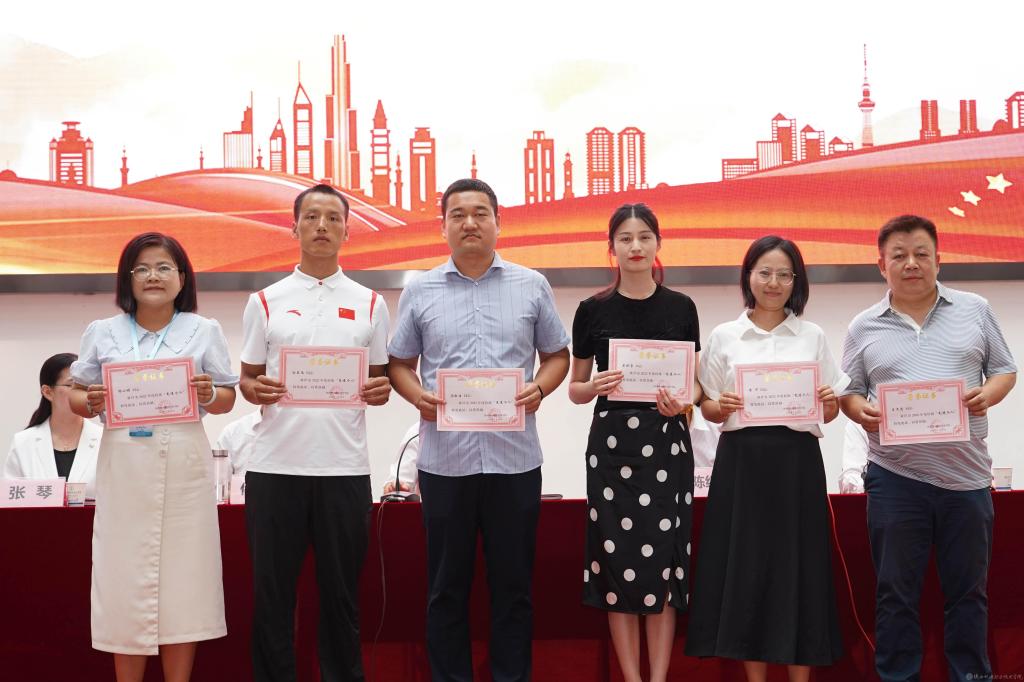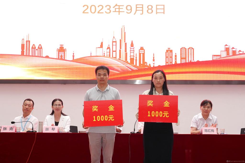 党委委员、院长助理赵争东宣读《陕西省教育厅关于公布2023年陕西省职业院校技能大赛结果的通知》,2022年度“强国杯”技术技能大赛LED显示屏装调与维修赛项全国总决赛表彰文件,第六届全国数字创意教学技能大赛陕西赛区获奖名单,2023年“互联网+”大学生创新创业大赛校赛以及2023年教学能力比赛校赛表彰文件并颁奖。