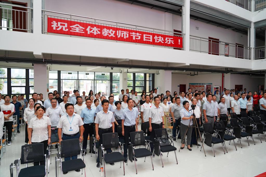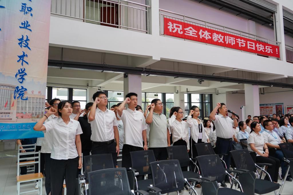 伊逊智强调,今年是学习贯彻习近平新时代中国特色社会主义思想主题教育的开局之年,是我国开启全面建设社会主义现代化国家新征程的关键之年,学校围绕“三步走”发展战略,按照“扩规模、提质量、创特色、树品牌”的总体思路,迁建蟠龙校区,拓展办学空间,改善办学条件,强化人才强校,深耕内涵发展,构建形成“一体两翼”专业发展格局和“九维育人”模式,在增强办学育人实力、提高人才培养质量等方面取得突出成绩,初步建成智能制造特色鲜明的“千亩万人”高职院校。他提出三点要求和希望:第一,坚守教育初心,争做“四有”好老师。广大教师要坚守仁而爱人,坚持“四个相统一”,善用大思政课为党育新人、为国育大才。带头弘扬社会主义核心价值观,点燃学生对真善美的追求向往,努力成为塑造学生品格、品行、品位的“大先生”。第二,持续提升自我,争做“四个引路人”。要牢固树立良好师德师风,加强教师队伍思想政治建设,打造政治素质过硬、业务能力精湛、育人水平高超的教师队伍,努力培养具有就业创业有本领、继续学习有基础、职业发展有潜力、民族复兴有担当的高素质技术技能人才和大国工匠。第三,始终爱校护校,争做学校事业的奋斗者。全面加强党的领导,坚定正确的政治方向,不折不扣贯彻落实好党中央关于教师工作的要求,坚持人才强校战略,围绕国家战略发展方向和地方经济社会发展布局,切实保证个人价值实现与学校事业跨越发展同向并行,增强“等不起”的紧迫感、“慢不得”的危机感、“坐不住”的责任感,持之以恒、不懈努力,力争取得新的更大成绩。