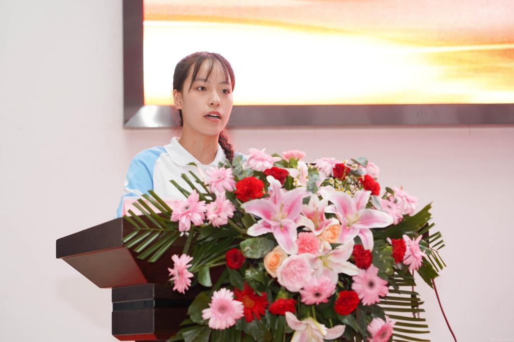 学生代表李妙桐发言:入学三年来,学校发生了天翻地覆的改变,校园环境更加整洁、学习氛围更加浓厚、文化活动更加丰富多彩。求学之路上,感恩陕机电每一位老师。