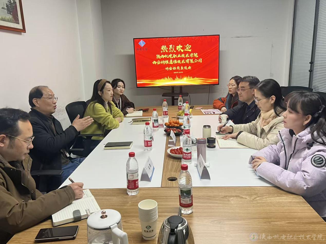随后,走访了西安纳维通讯技术有限公司,作为学校长期合作企业,双方围绕深化产教融合展开深度交流。张琴表示,学校始终坚持以产业需求为导向,希望与企业进一步拓展合作维度,在课程体系共建、实践教学改革等方面携手发力,培养更多符合行业发展需要的高素质技术技能人才。双方明确了2026 届毕业生招聘计划,企业将于下学期初入校开展专场宣讲,为毕业生提供技术研发、生产运维等多个岗位的就业机会。