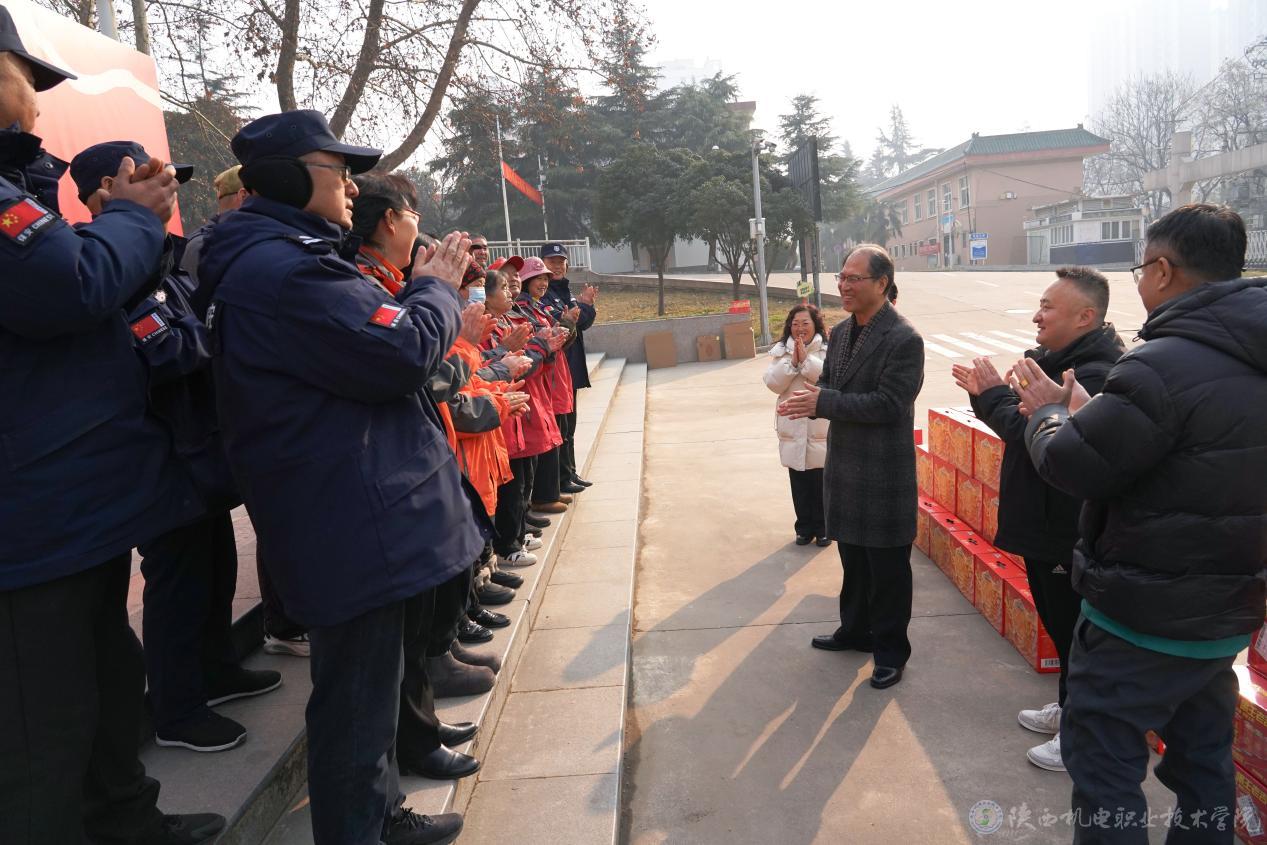 来自门岗、巡逻、消防控制室、维修、保洁、公寓值班、锅炉房以及学校值班教师等各个岗位的值班人员齐聚至小广场处,现场气氛温馨而热烈。伊逊智与大家亲切交谈,详细询问节日期间的工作和生活情况,对大家“舍小家、顾大家”的奉献精神表示衷心感谢。他强调,校园安全稳定和各项保障工作离不开每一位值班人员的辛勤付出,希望大家继续发扬敬业精神,严格落实值班制度,确保寒假期间校园平安和谐。